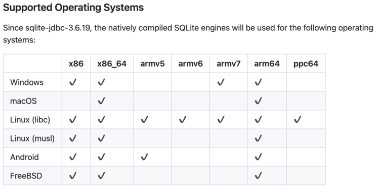 Look at the matrix of SQLite-JDBC supported operating systems:
